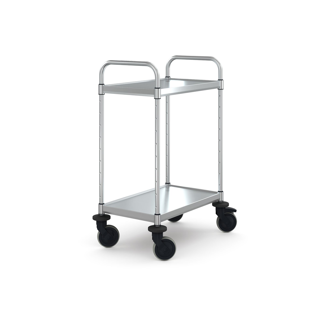 Zerlegbarer Servierwagen in stabiler, selbsttragender und hygienischer Konstruktion aus hochwertigem, rostfreiem Edelstahl. Rundrohrrahmen Ø 25 mm mit verstellbaren, allseitig abgekanteten, höhenverstellbaren Borden mit einer stabilen Klemmvorrichtung.