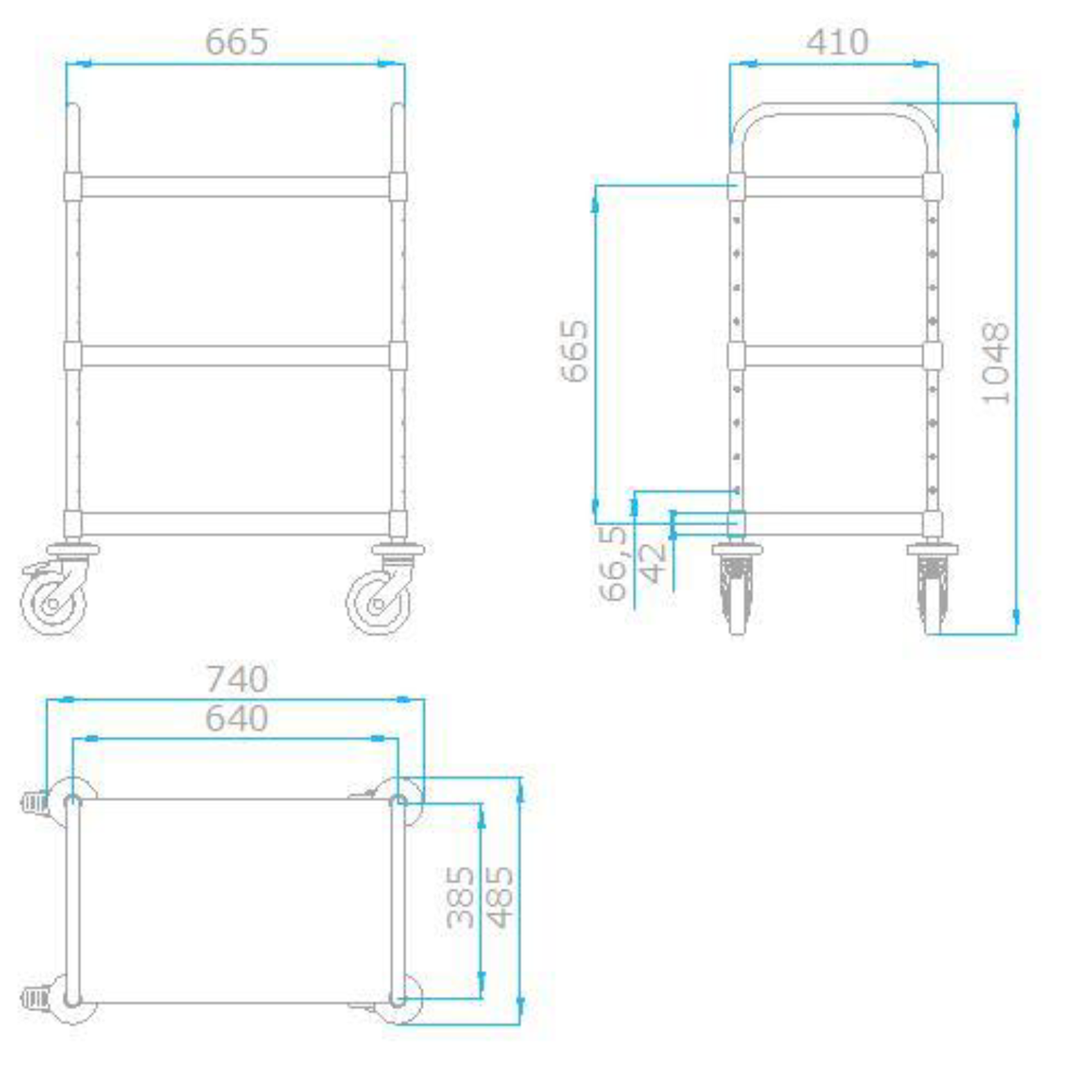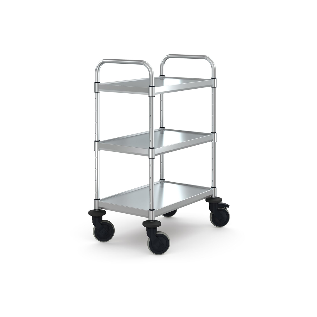 Zerlegbarer Servierwagen in stabiler, selbsttragender und hygienischer Konstruktion aus hochwertigem, rostfreiem Edelstahl. Rundrohrrahmen Ø 25 mm mit verstellbaren, allseitig abgekanteten, höhenverstellbaren Borden mit einer stabilen Klemmvorrichtung.