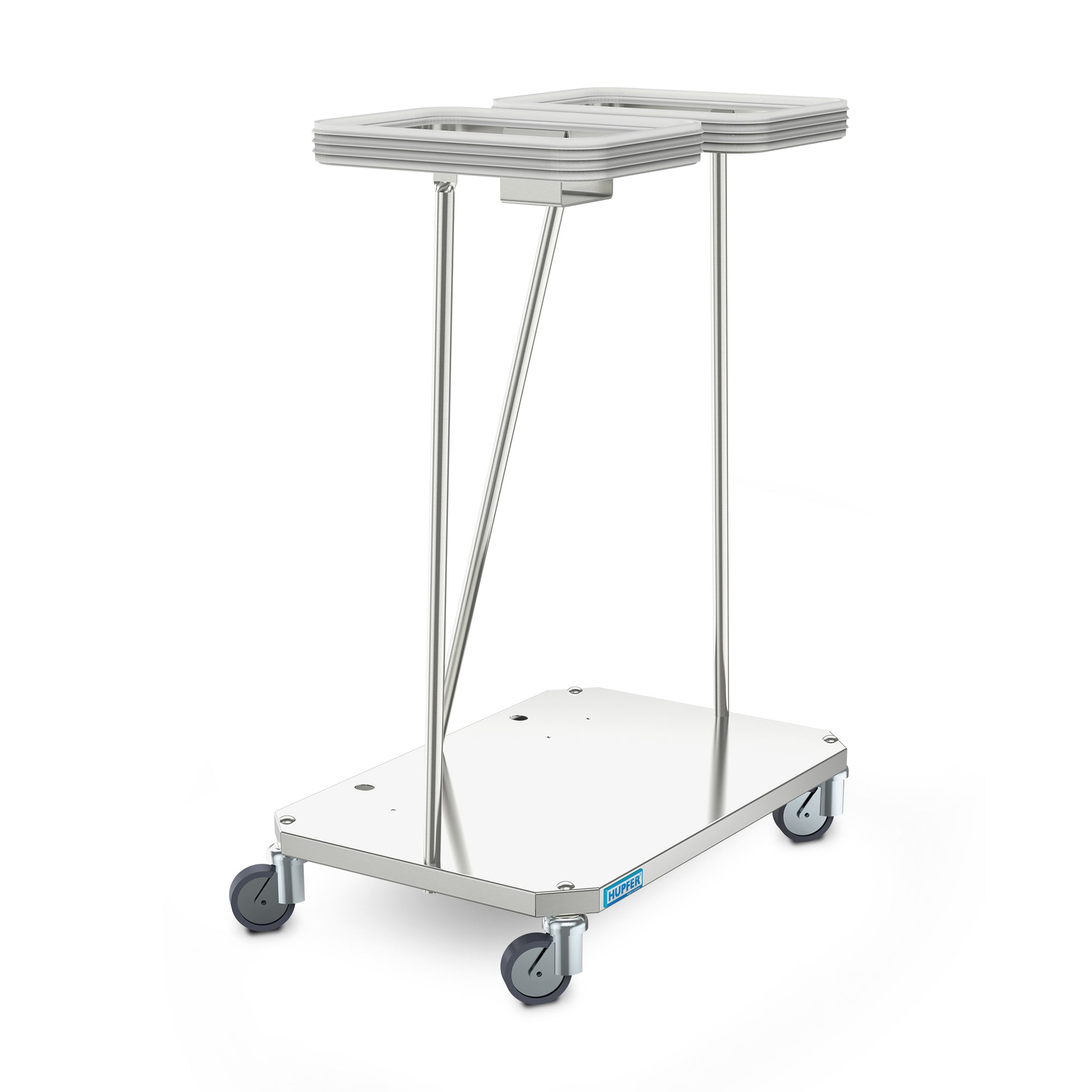Edelstahl Sammler in offener Ausführung, 2-fach, für Aufnahme und Transport von Abfällen oder Schmutzwäsche in handelsüblichen Transportsäcken. Wagen in stabiler, selbsttragender und hygienischer Konstruktion aus hochwertigem Edelstahl. Offene Konstruktion bestehend aus einem oberen Halterahmen mit integrierter Gummidichtung zur festen und hygienischen Aufnahme des Transportsacks. Rahmen auf zwei Standrohren, fest auf einer allseitig abgekanteten Bodenplatte verschweißt. Sammler fahrbar auf 4 Lenkrollen, davon 2 mit Totalfeststellern, ø 75 mm, in korrosionsgeschützten Gehäusen, mit Rückenlochbefestigung.